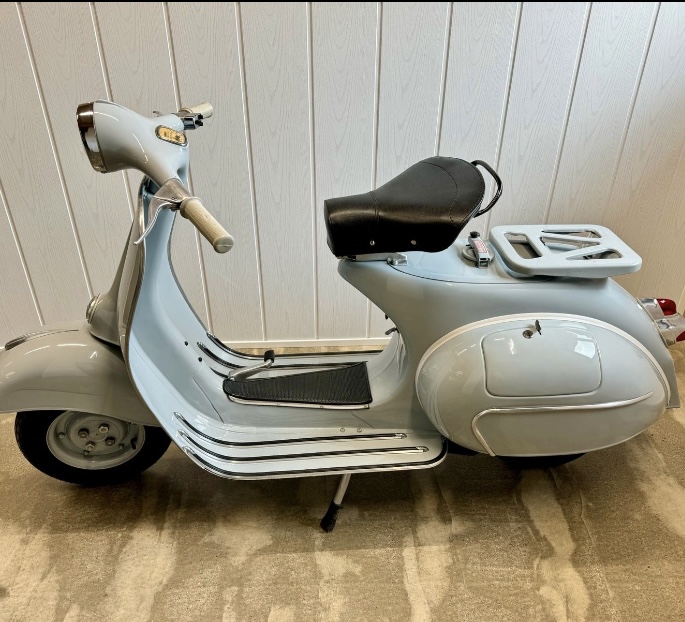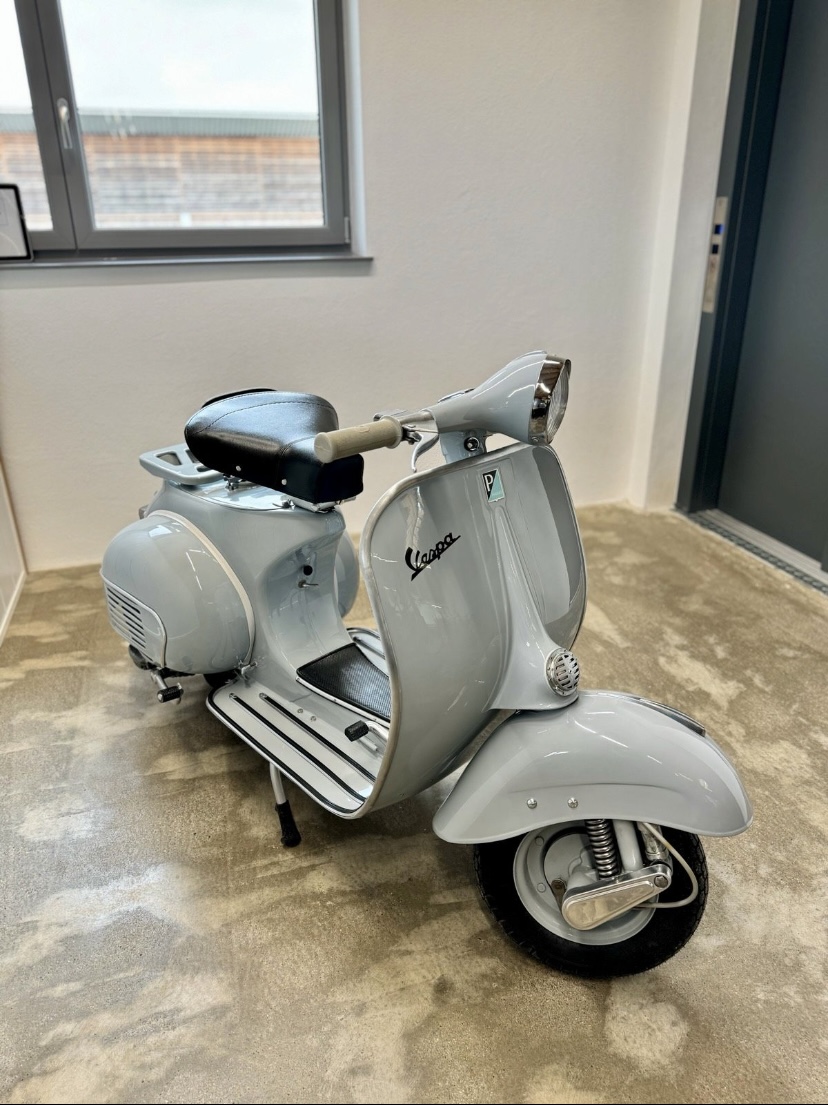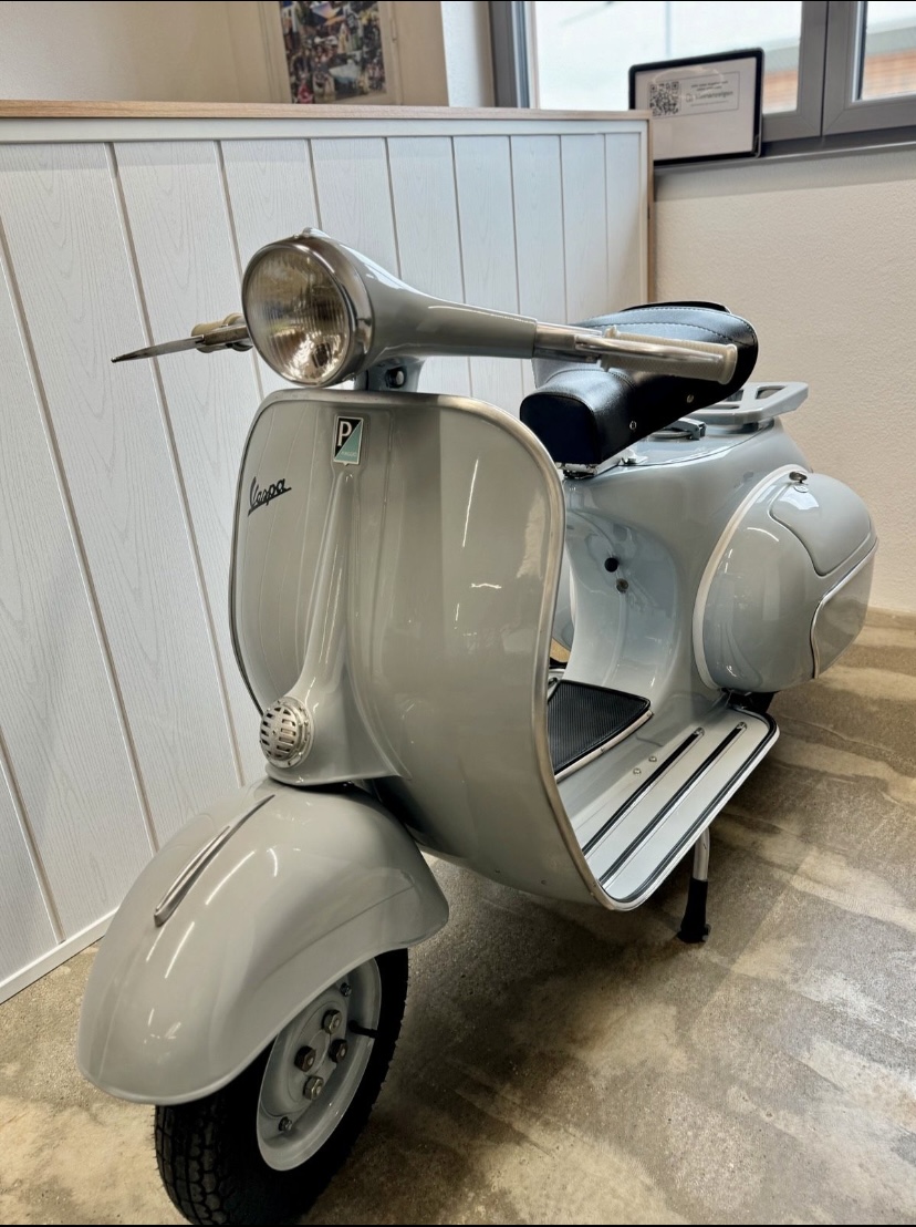 Hier steht eine wunderschöne, komplett restaurierte Vespa VNB4 aus dem Baujahr 1963 zum verkauf. In der wunderschönen Hellgrau Grauer Amethyst 710 Farbe ist sie zwar schlicht jedoch auch gut aussehend. Die Vespa hat TÜV bis 2026 und hat deutsche Papiere .